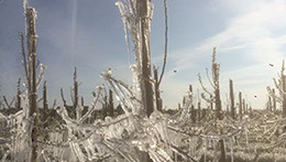 Um dies zu verhindern, nutzen wir die Physik. Bei Frost schalten wir die Beregnungsanlage ein. Durch die Temperaturen unter dem Gefrierpunkt, gefriert das Wasser an der Blüte und bildet einen Eispanzer. Jetzt kommt die Physik ins Spiel: Durch ständig neu gefrierendes Wasser wird die sogenannte Erstarrungswärme frei. Diese schützt unsere wertvolle Blüte vor Minusgraden im inneren des Eispanzers. So können wir sicherstellen, Ihnen Jahr für Jahr unsere schmackhaften Äpfel anzubieten.